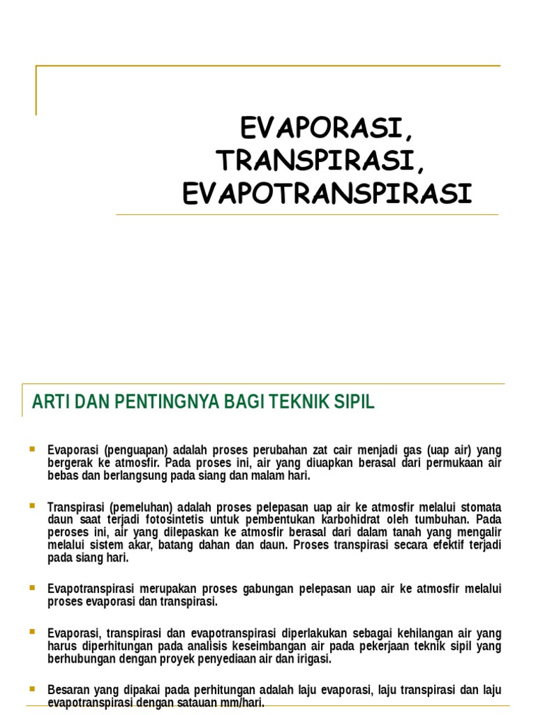 Salah satunya yang selalu terjadi setiap hari adalah proses penguapan atau yang. Laju evaporasi adalah laju neto antara evaporasi dan kondensasi yang sebanding dengan perbedaan tekanan uap air dipermukaan air dan tekanan uap air di udara di atasnya. Pengertian evaporasi, kondensasi, transpirasi dan gutasi. Panas tersebut dapat atau bisa disuplai dengan segala amcam cara, baik secara alami serta juga penambahan. Evapotranspirasi adalah gabungan evaporasi dan transpirasi tumbuhan yang hidup di permukaan bumi.